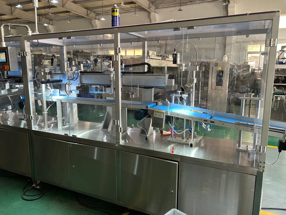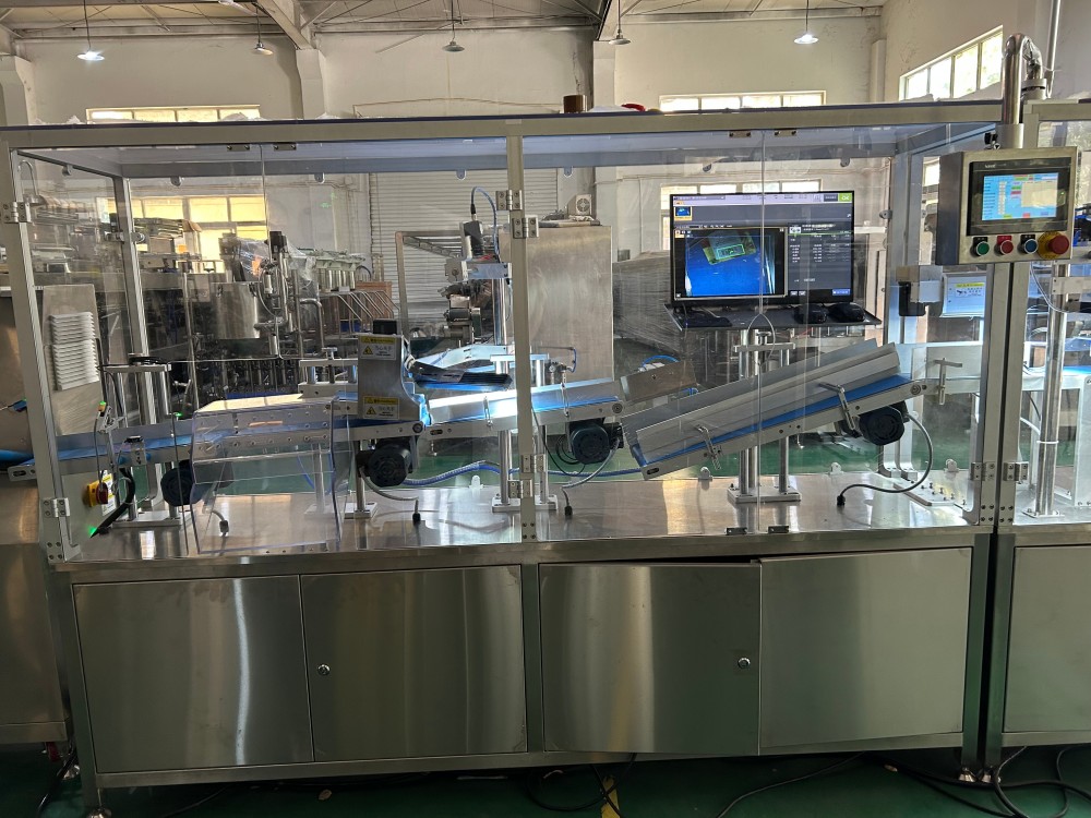 This is a solution for a juice packaging production line. It consists of an HFFS machine, metal detector, water sterilization system, multiple vision inspection systems, a tube attaching machine, and an automatic box packing system.
